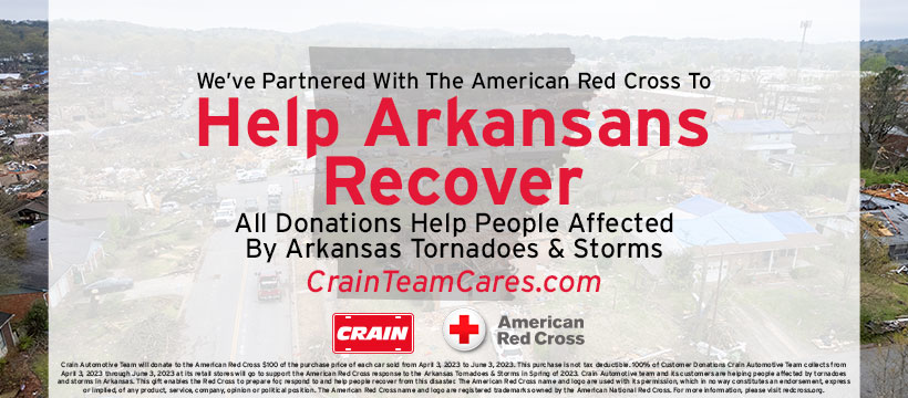 Crain Automotive Team will donate $100 for each car sold from April 3, 2023, to June 3, 2023. This purchase is not tax deductible. 100% of Customer Donations Crain Automotive Team collects from April 3, 2023, through June 3, 2023, at its retail stores will go to support the American Red Cross response to the Arkansas Tornadoes & Storms in the Spring of 2023. The Crain Automotive team and its customers are helping people affected by tornadoes and storms in Arkansas. This gift enables the Red Cross to prepare for, respond to, and help people recover from this disaster.